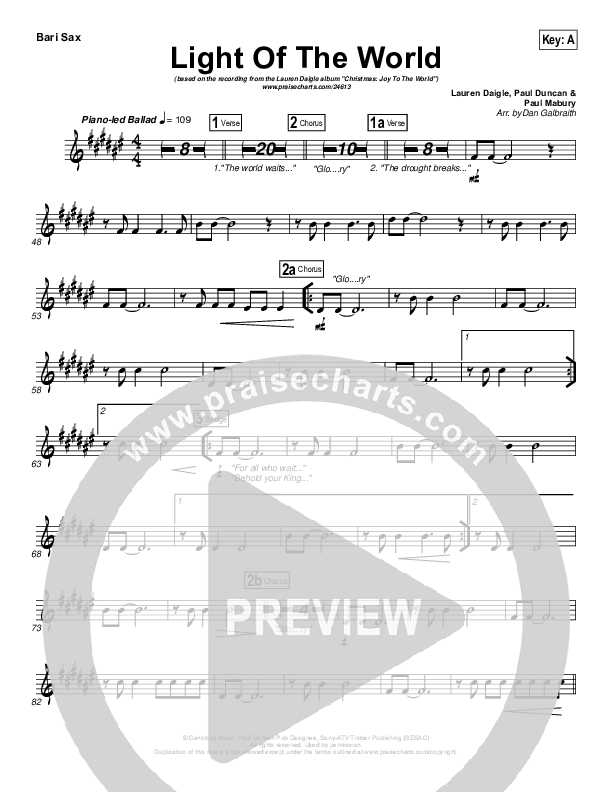 Download the Bari Sax sheet music for Light Of The World by Lauren Daigle, from the album Light Of The World. This song was arranged by Daniel Galbraith in the key of A, Ab, Bb, G, Gb.