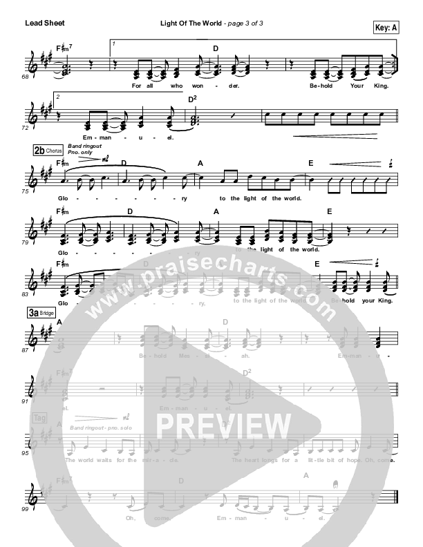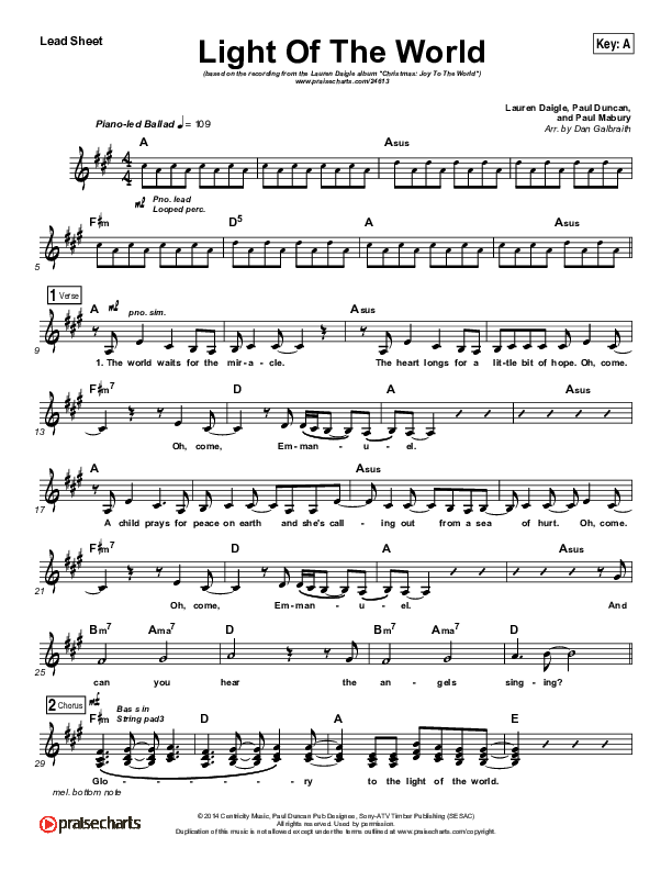 Download the sheet music for Light Of The World by Lauren Daigle, from the album Light Of The World. This song was arranged by Daniel Galbraith in the key of A, Ab, Bb, G, Gb.