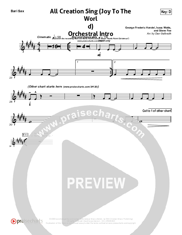 Download the Bari Sax sheet music for All Creation Sing (Joy To The World) (Instrumental Intro) by North Point Worship, from the album North Point Christmas. This song was arranged by Daniel Galbraith in the key of C, D.
