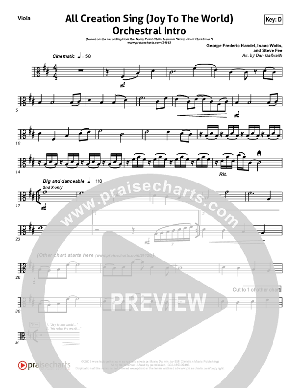 Download the Viola sheet music for All Creation Sing (Joy To The World) (Instrumental Intro) by North Point Worship, from the album North Point Christmas. This song was arranged by Daniel Galbraith in the key of C, D.