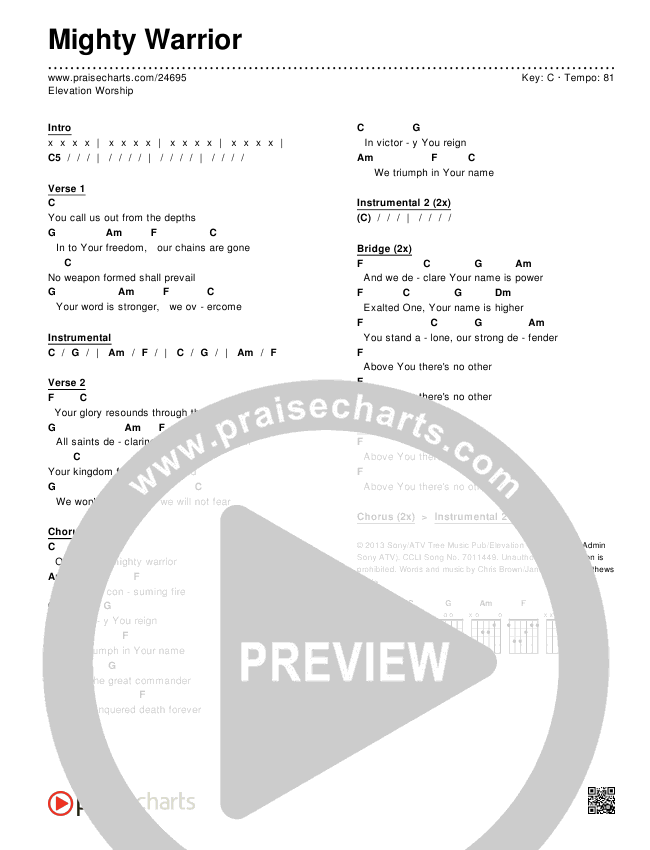 Download the PDF Chord Charts for Mighty Warrior by Elevation Worship, from the album Only King Forever. This song was arranged by Daniel Galbraith in the key of Bb, C.