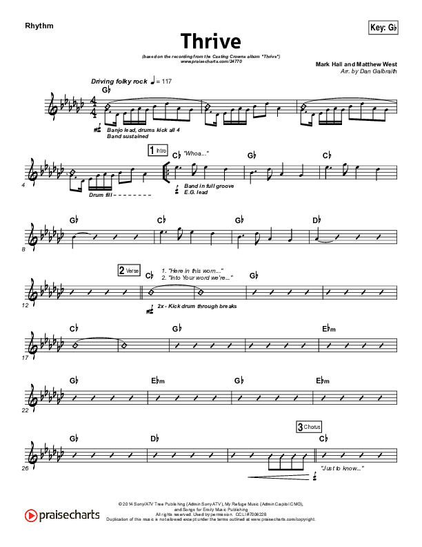 Download the Rhythm Chart for Thrive by Casting Crowns, from the album Thrive. This song was arranged by Daniel Galbraith in the key of F, G, Gb.