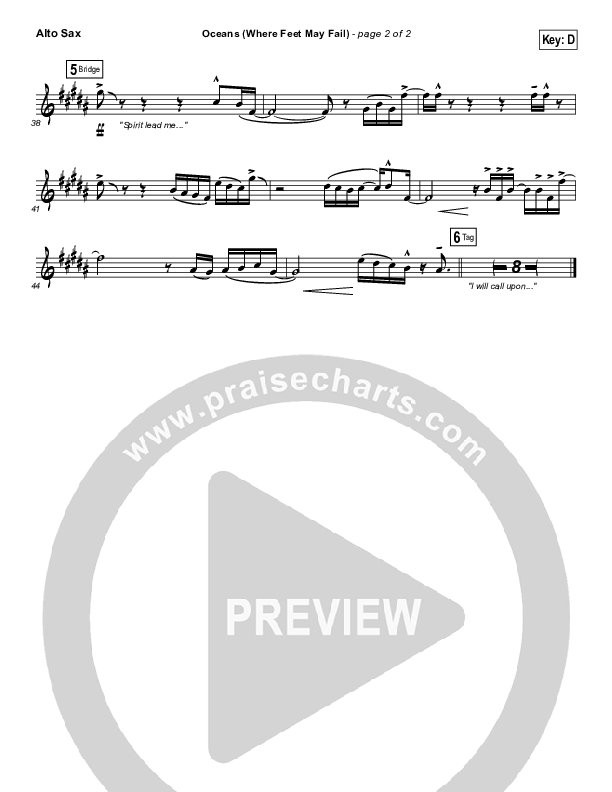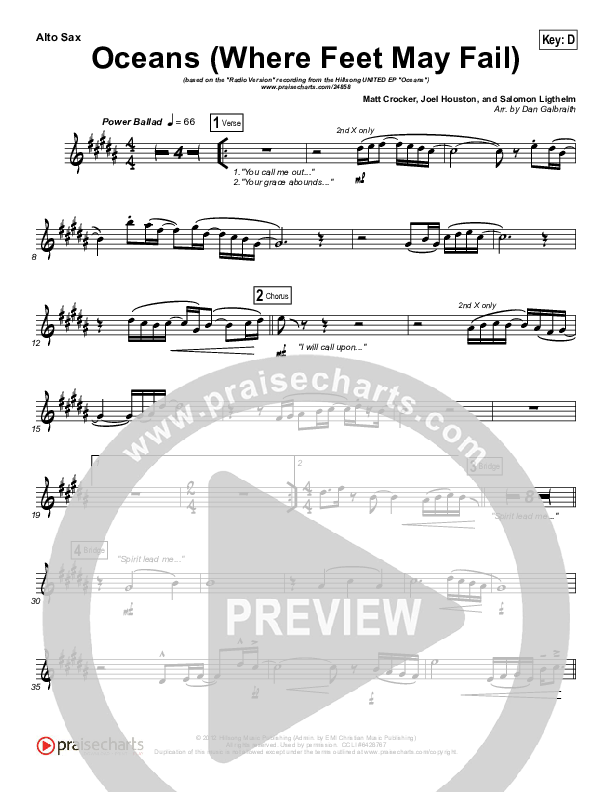 Download the AltoSax sheet music for Oceans (Where Feet May Fail) (Radio) by Hillsong UNITED / TAYA, from the album Oceans. This song was arranged by Daniel Galbraith in the key of D, Db, Eb.