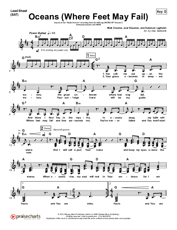 Download the sheet music for Oceans (Where Feet May Fail) (Radio) by Hillsong UNITED / TAYA, from the album Oceans. This song was arranged by Daniel Galbraith in the key of D, Db, Eb.