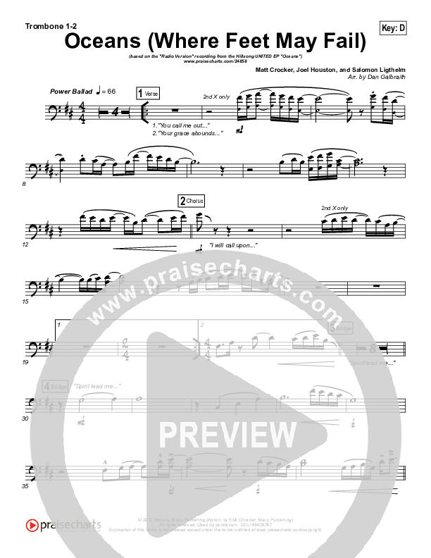 Download the Trombone 1,2 sheet music for Oceans (Where Feet May Fail) (Radio) by Hillsong UNITED / TAYA, from the album Oceans. This song was arranged by Daniel Galbraith in the key of D, Db, Eb.