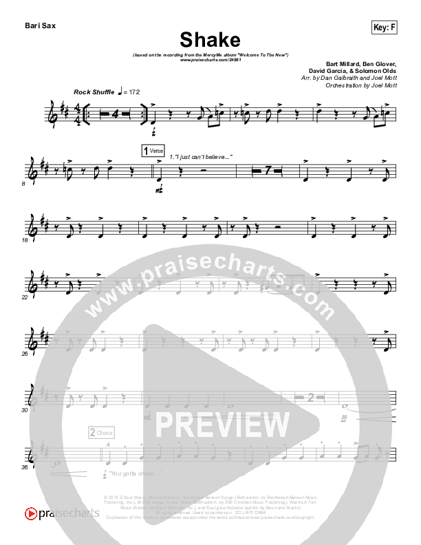 Download the Bari Sax sheet music for Shake by MercyMe, from the album Welcome To The New. This song was arranged by Joel Mott in the key of D, F.