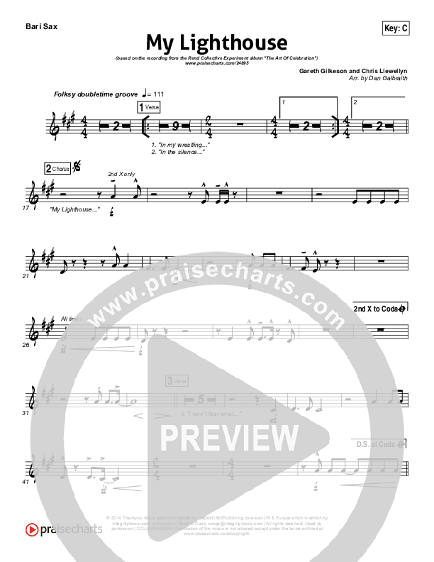 Download the Bari Sax sheet music for My Lighthouse by Rend Collective, from the album The Art Of Celebration. This song was arranged by Daniel Galbraith in the key of B, Bb, C.