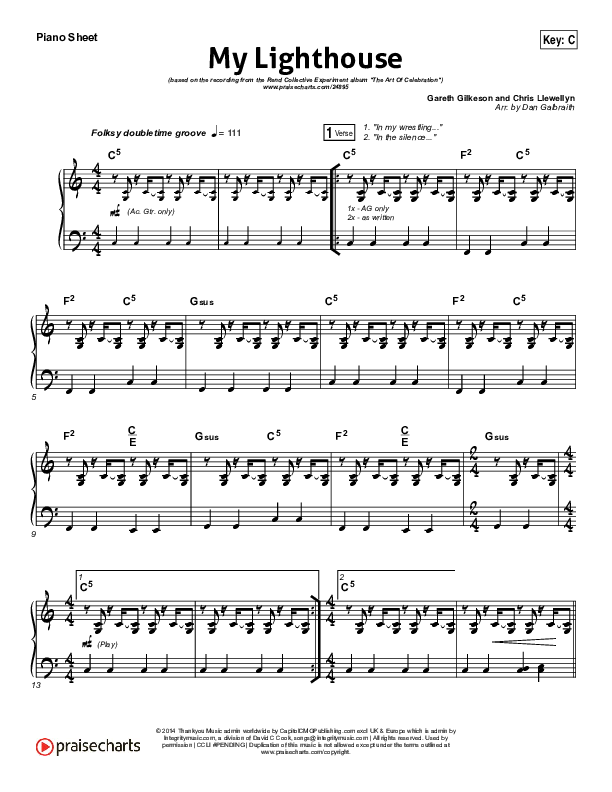 Download the piano sheet for My Lighthouse by Rend Collective, from the album The Art Of Celebration. This song was arranged by Daniel Galbraith in the key of B, Bb, C.