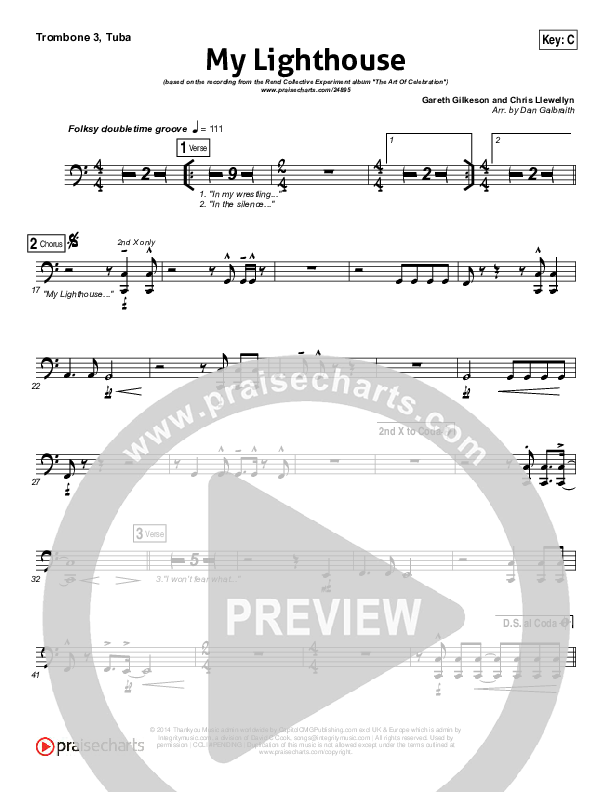 Download the Trombone 3/Tuba sheet music for My Lighthouse by Rend Collective, from the album The Art Of Celebration. This song was arranged by Daniel Galbraith in the key of B, Bb, C.