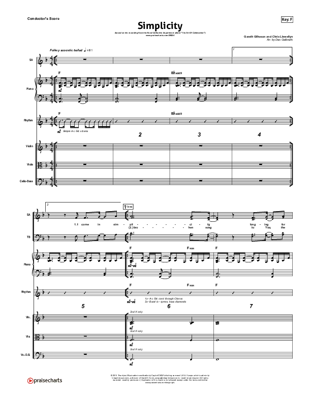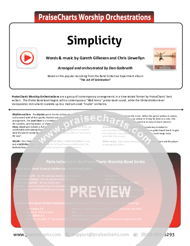 Download the Orchestration for Simplicity by Rend Collective, from the album The Art Of Celebration. This song was arranged by Daniel Galbraith in the key of E, F.