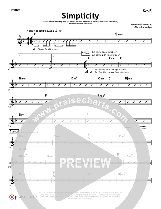 Download the Rhythm Chart for Simplicity by Rend Collective, from the album The Art Of Celebration. This song was arranged by Daniel Galbraith in the key of E, F.