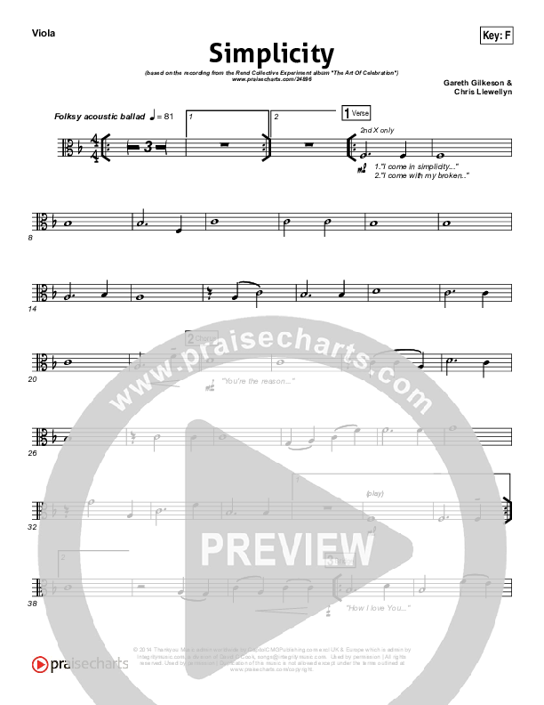 Download the Viola sheet music for Simplicity by Rend Collective, from the album The Art Of Celebration. This song was arranged by Daniel Galbraith in the key of E, F.