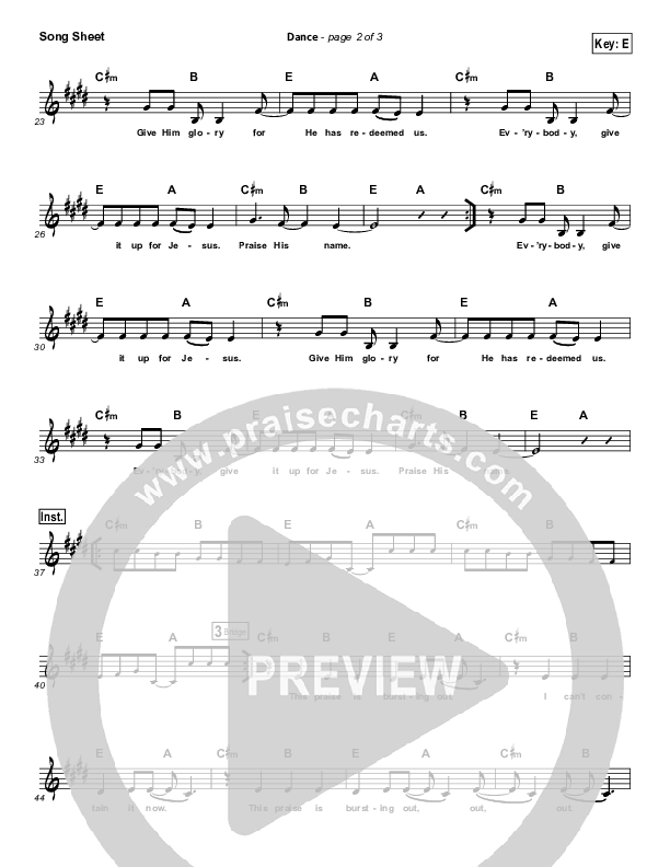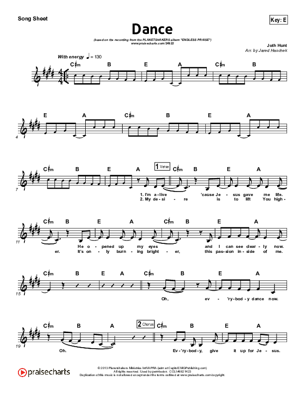 Download the sheet music for Dance by Planetshakers, from the album Endless Praise. This song was arranged by Jared Haschek in the key of D, E.