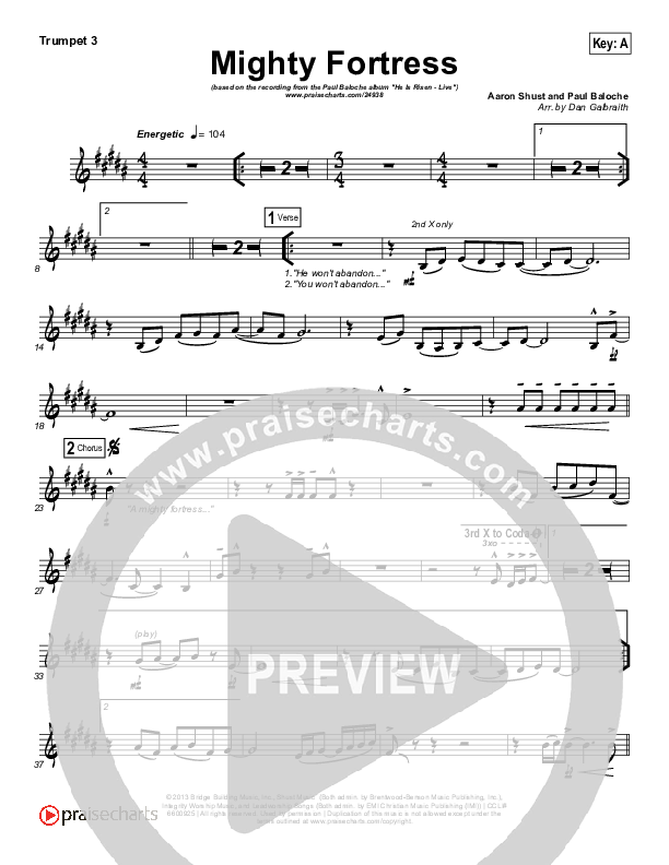 Download the Trumpet 3 sheet music for Mighty Fortress by Paul Baloche, from the album Paul Baloche Live. This song was arranged by Daniel Galbraith in the key of A, G.