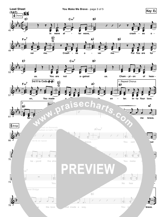 Download the Orchestration for You Make Me Brave by Amanda Lindsey Cook / Bethel Music, from the album You Make Me Brave - Live At The Civic. This song was arranged by Daniel Galbraith / Joel Mott in the key of D, E, Eb, F, G, Gb.