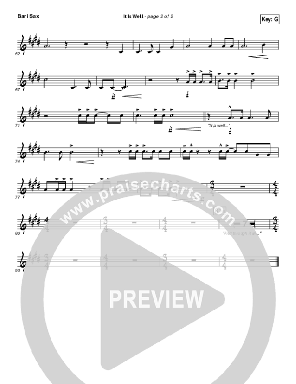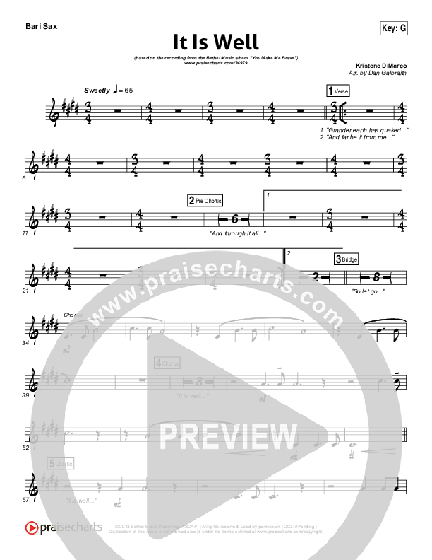 Download the Bari Sax sheet music for It Is Well by Kristene DiMarco / Bethel Music, from the album You Make Me Brave - Live At The Civic. This song was arranged by Daniel Galbraith in the key of A, Ab, Bb, G.