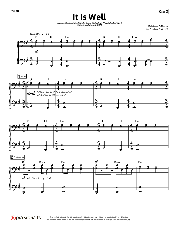 Download the piano sheet for It Is Well by Kristene DiMarco / Bethel Music, from the album You Make Me Brave - Live At The Civic. This song was arranged by Daniel Galbraith in the key of A, Ab, Bb, G.