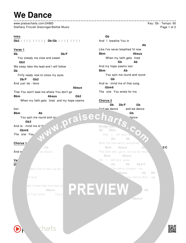 Download the PDF Chord Charts for We Dance by Bethel Music, from the album You Make Me Brave - Live At The Civic. This song was arranged by Daniel Galbraith in the key of D, Db.