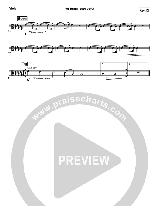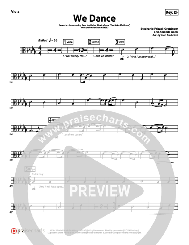 Download the Viola sheet music for We Dance by Bethel Music, from the album You Make Me Brave - Live At The Civic. This song was arranged by Daniel Galbraith in the key of D, Db.