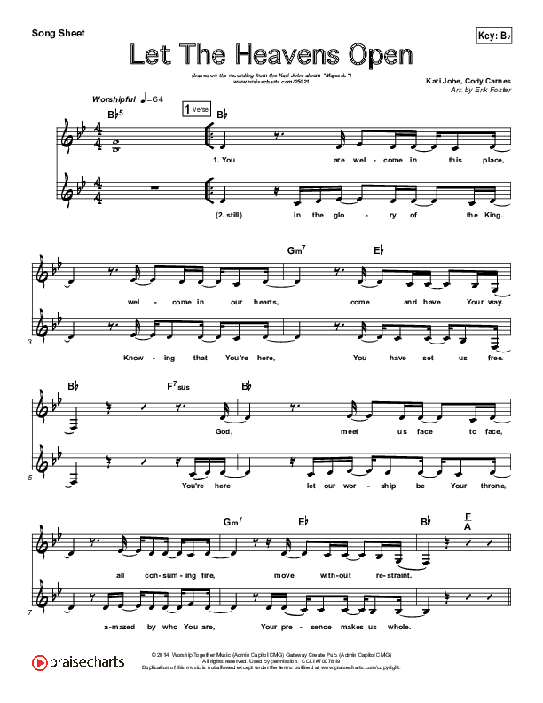 Download the sheet music for Let The Heavens Open by Kari Jobe, from the album Majestic. This song was arranged by Erik Foster in the key of Bb, C.