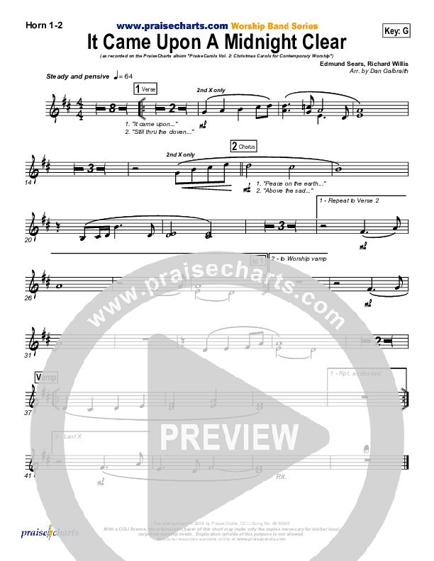 Download the French Horn sheet music for It Came Upon A Midnight Clear by Kari Jobe / PraiseCharts Band / Arr. Daniel Galbraith, from the album PraiseCarols (Vol. 2). This song was arranged by Daniel Galbraith in the key of Ab, G.