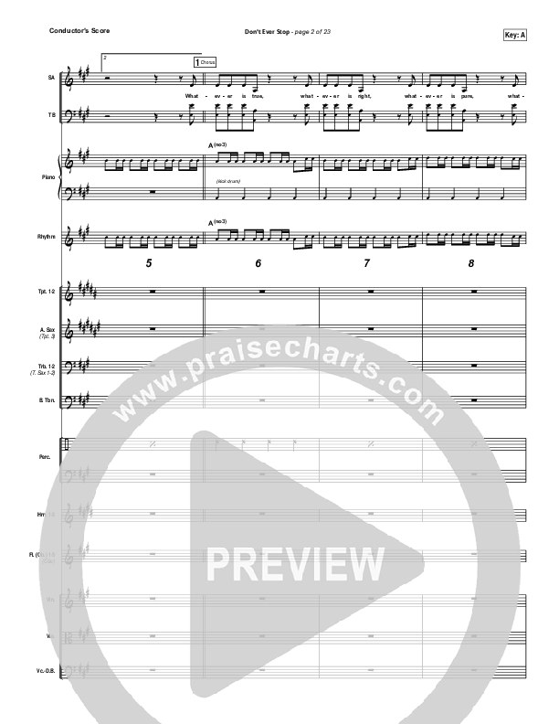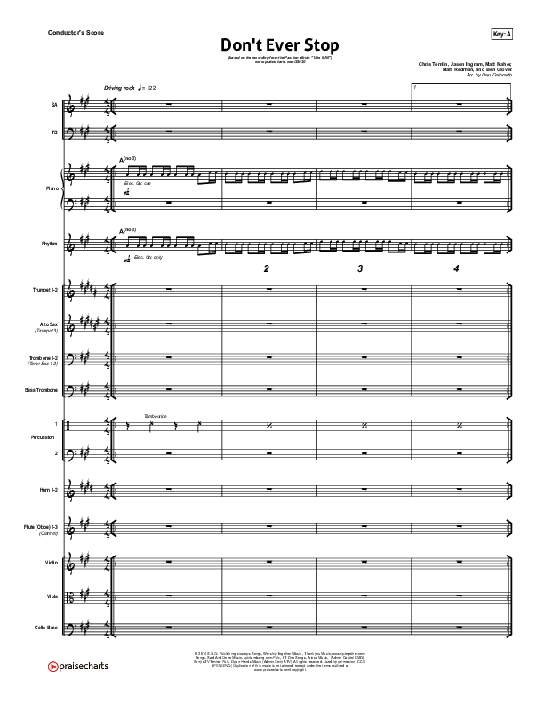 Download the Orchestration for Don't Ever Stop by Chris Tomlin / Passion, from the album Take It All. This song was arranged by Daniel Galbraith in the key of A, Bb.