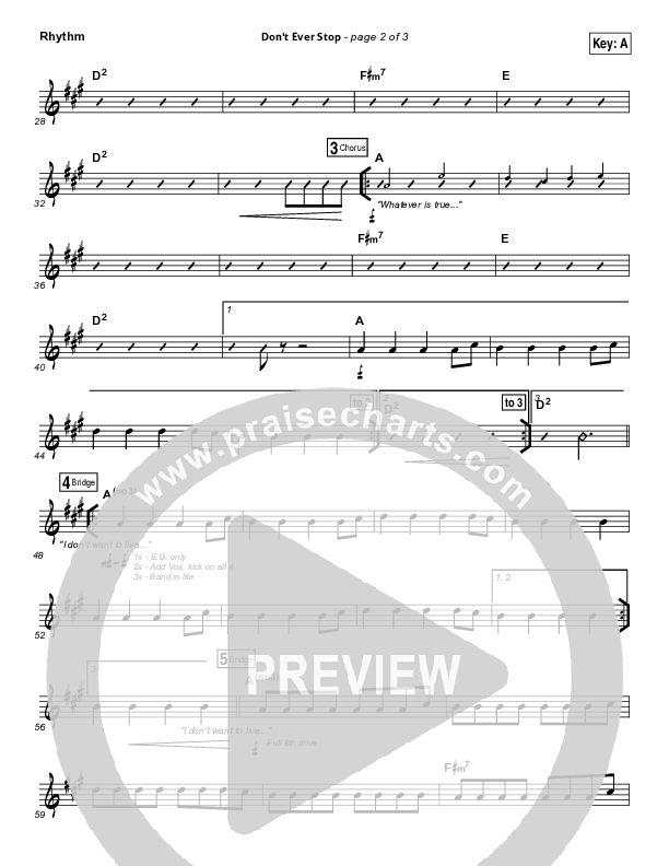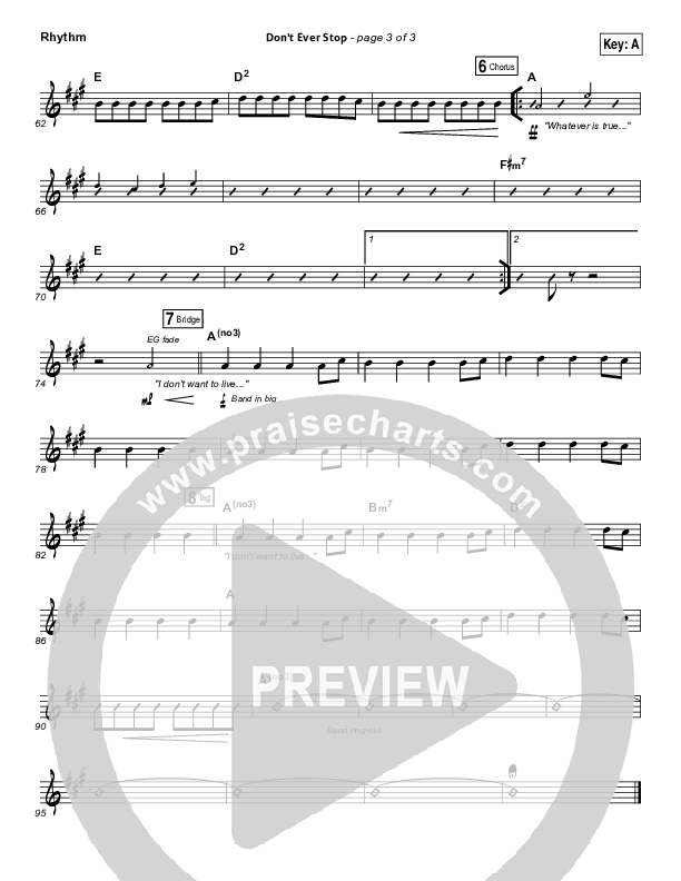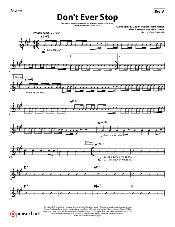 Download the Rhythm Chart for Don't Ever Stop by Chris Tomlin / Passion, from the album Take It All. This song was arranged by Daniel Galbraith in the key of A, Bb.