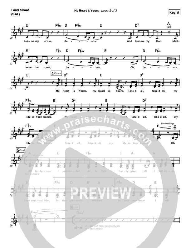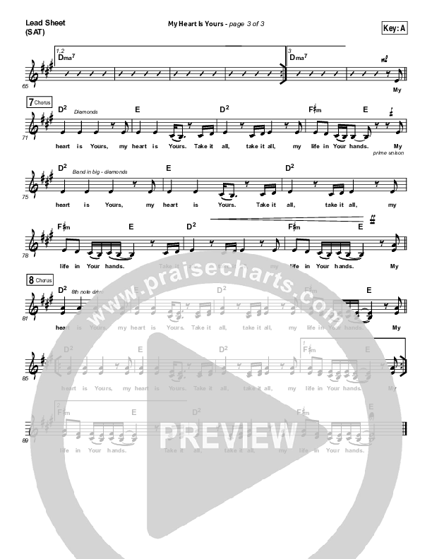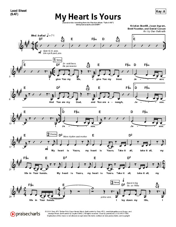 Download the sheet music for My Heart Is Yours by Kristian Stanfill / Passion, from the album Take It All. This song was arranged by Daniel Galbraith in the key of A, Bb.