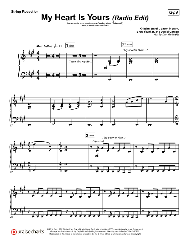 Download the Orchestration for My Heart Is Yours (Radio) by Kristian Stanfill / Passion, from the album Take It All. This song was arranged by Daniel Galbraith in the key of A, Bb.