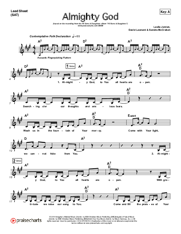 Download the sheet music for Almighty God by All Sons & Daughters / Sandra McCracken, from the album All Sons & Daughters. This song was arranged by Dave Iula in the key of A, Bb.