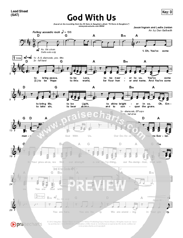 Download the sheet music for God With Us by All Sons & Daughters, from the album All Sons & Daughters. This song was arranged by Daniel Galbraith in the key of C, D, Eb.