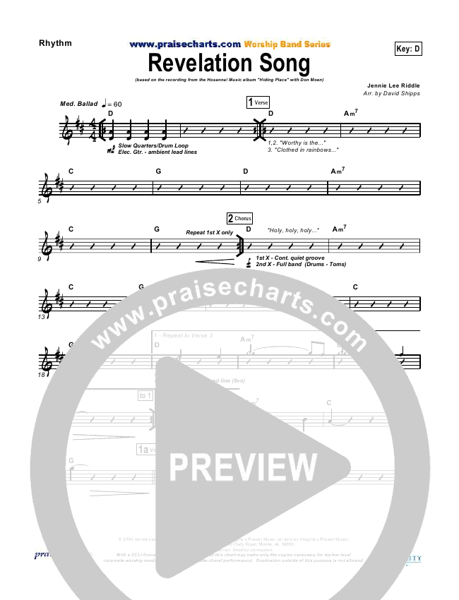 Download the Rhythm Chart for Revelation Song by Don Moen, from the album Hiding Place. This song was arranged by David Shipps in the key of D, Eb.