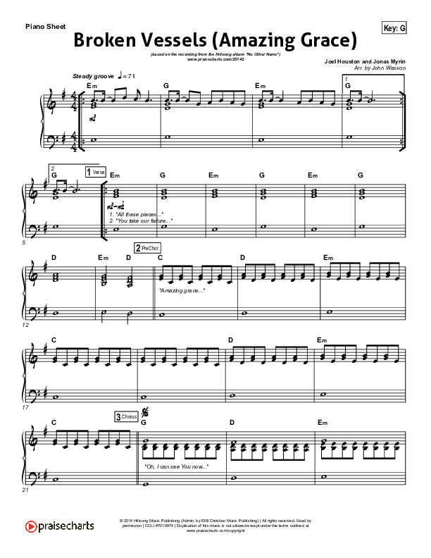 Download the piano sheet for Broken Vessels (Amazing Grace) by Hillsong Worship, from the album No Other Name. This song was arranged by John Wasson in the key of A, Bb, F, G, Gb.