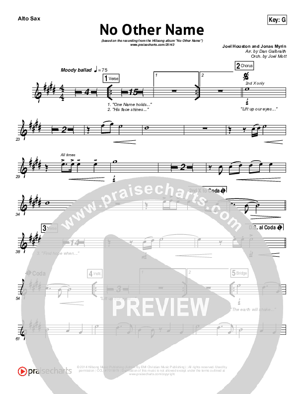Download the AltoSax sheet music for No Other Name by Hillsong Worship, from the album No Other Name. This song was arranged by Daniel Galbraith / Joel Mott in the key of Ab, F, G.