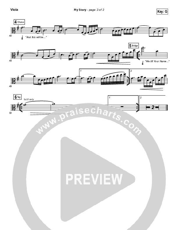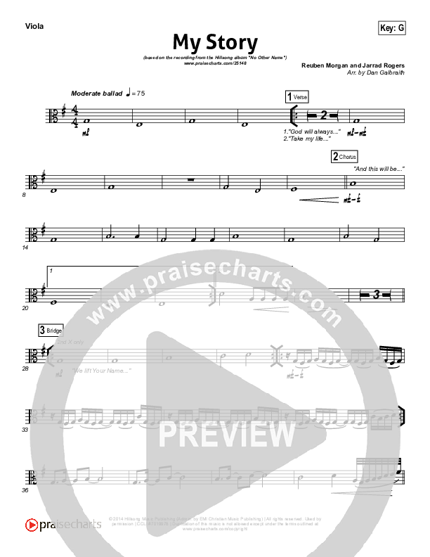 Download the Viola sheet music for My Story by Hillsong Worship, from the album No Other Name. This song was arranged by Daniel Galbraith in the key of F, G.
