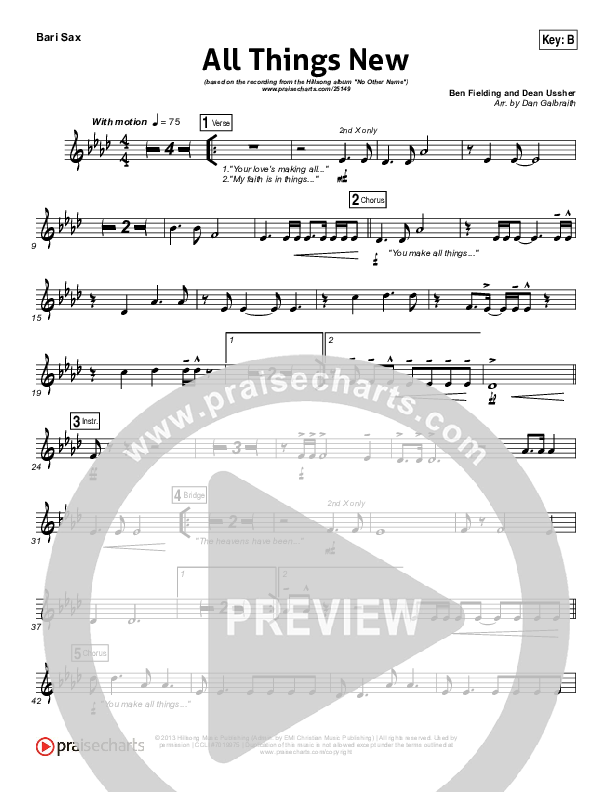 Download the Bari Sax sheet music for All Things New by Hillsong Worship, from the album No Other Name. This song was arranged by Daniel Galbraith in the key of B, Bb.