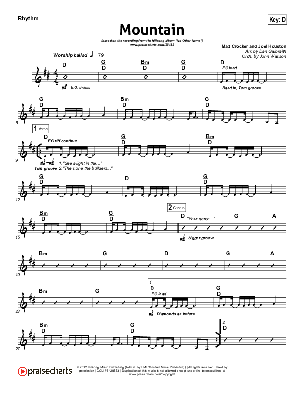 Download the Rhythm Chart for Mountain by Hillsong Worship, from the album No Other Name. This song was arranged by Daniel Galbraith / John Wasson in the key of C, D.
