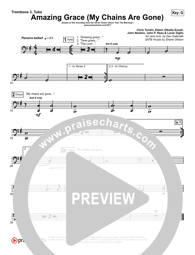 Download the Orchestration brass parts for Amazing Grace (My Chains Are Gone) by Chris Tomlin, from the album See The Morning. This song was arranged by Daniel Galbraith in the key of D, E, Eb, F, G.