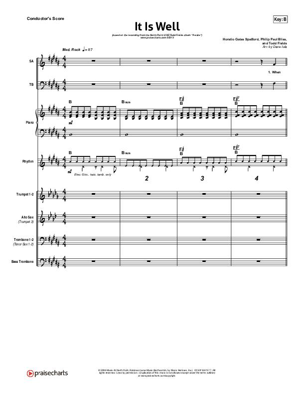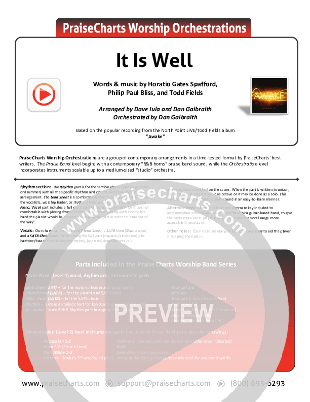 Download the Orchestration for It Is Well by Todd Fields / North Point Worship, from the album Awake. This song was arranged by Dave Iula / Daniel Galbraith in the key of B, Bb, C.