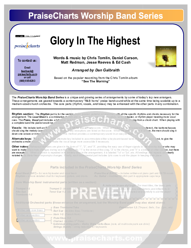 Download the Orchestration for Glory In The Highest by Chris Tomlin, from the album See The Morning. This song was arranged by Daniel Galbraith in the key of A, Bb, C.