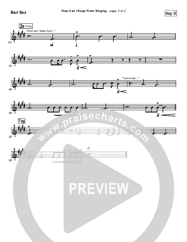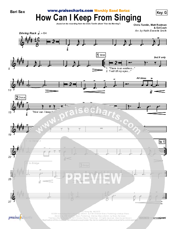 Download the Bari Sax sheet music for How Can I Keep From Singing by Chris Tomlin, from the album See The Morning. This song was arranged by Keith Everette Smith in the key of A, Bb, G.