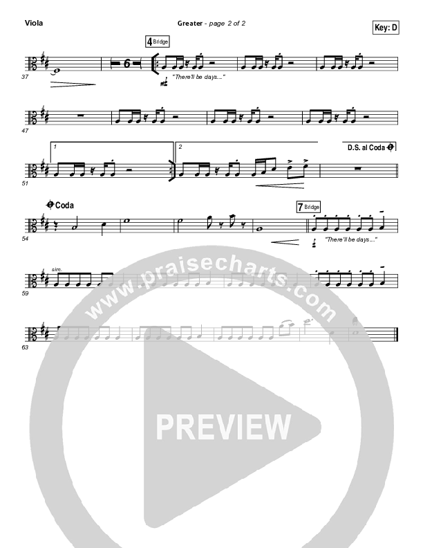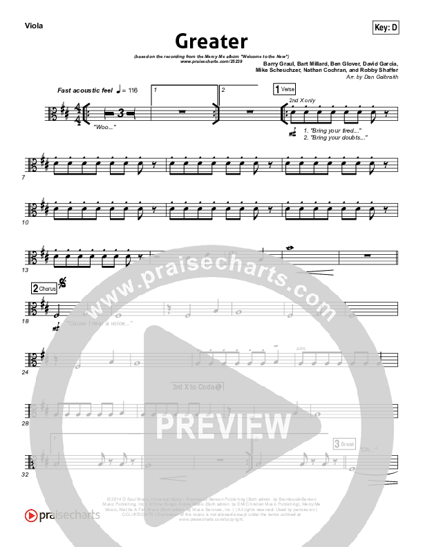 Download the Viola sheet music for Greater by MercyMe, from the album Welcome To The New. This song was arranged by Daniel Galbraith in the key of A, Ab, C, D, G.