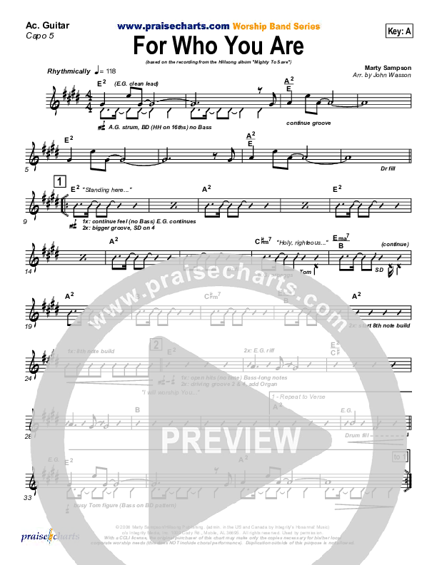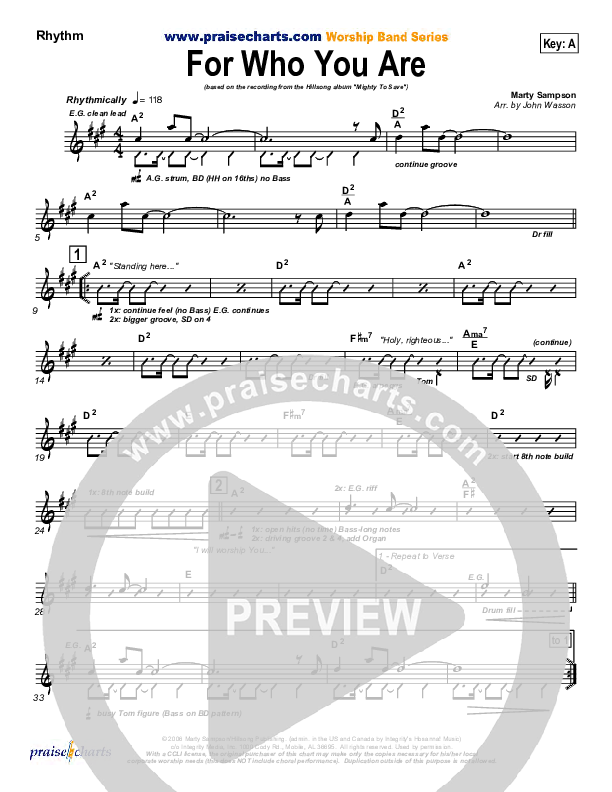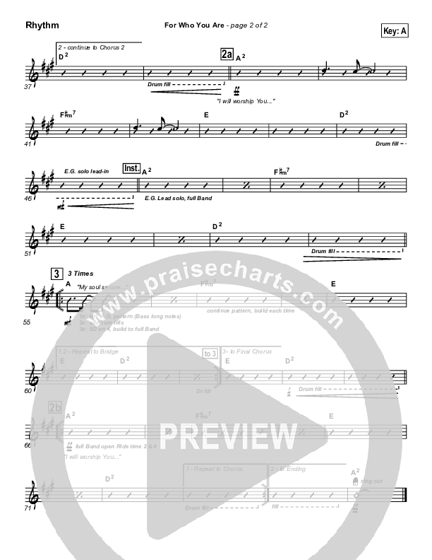 Download the Rhythm Chart for For Who You Are by Hillsong Worship, from the album Mighty To Save. This song was arranged by John Wasson in the key of A, B, Bb.