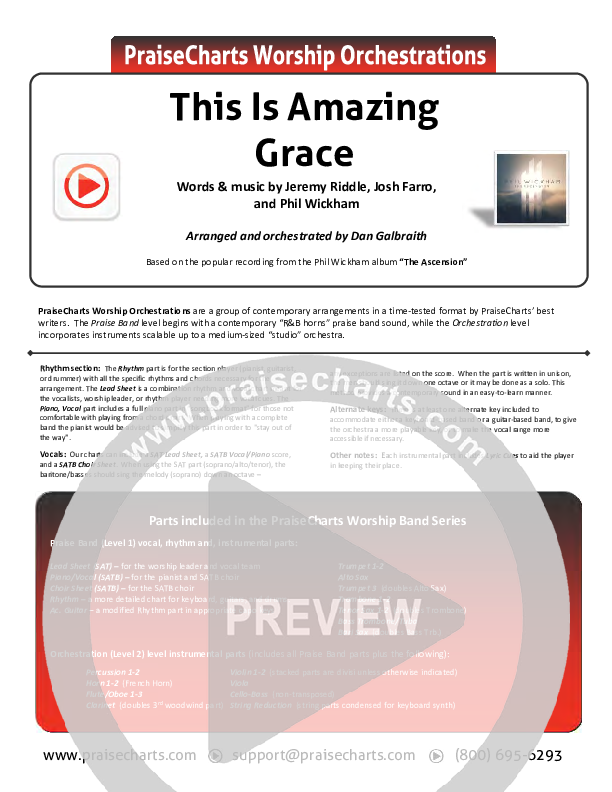 Download the Orchestration for This Is Amazing Grace by Phil Wickham, from the album The Ascension. This song was arranged by Joel Mott in the key of A, Ab, Bb, C, D, E, F, G.