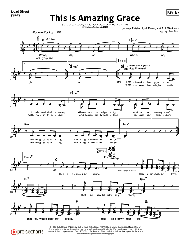 Download the sheet music for This Is Amazing Grace by Phil Wickham, from the album The Ascension. This song was arranged by Joel Mott in the key of A, Ab, Bb, C, D, E, F, G.