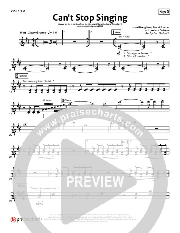 Download the Violin sheet music for Can't Stop Singing by Covenant Worship / Nicole Binion / Joshua Dufrene / Israel Houghton, from the album Kingdom. This song was arranged by Daniel Galbraith in the key of C, D.