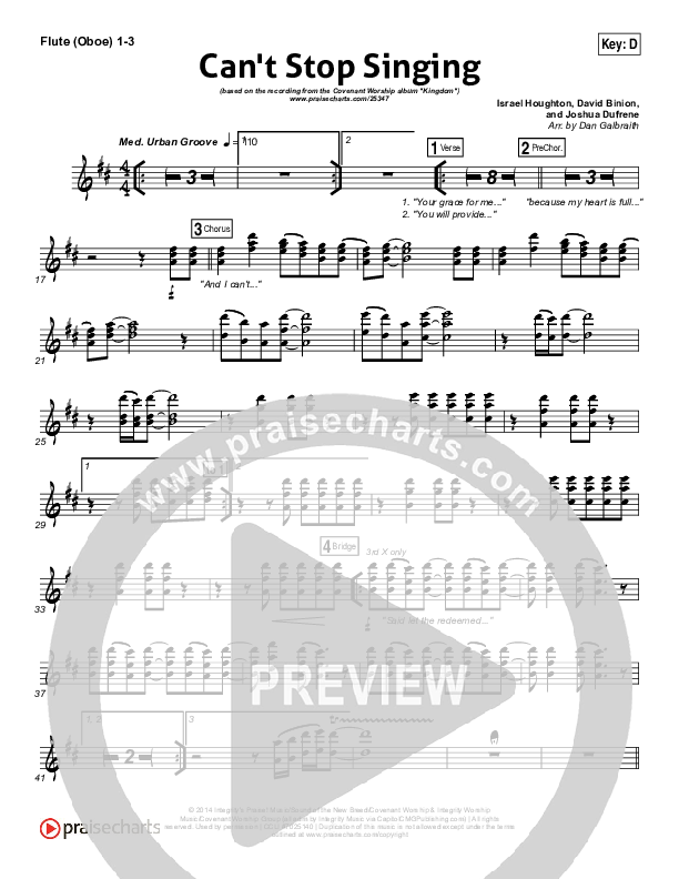 Download the Orchestration wind parts for Can't Stop Singing by Covenant Worship / Nicole Binion / Joshua Dufrene / Israel Houghton, from the album Kingdom. This song was arranged by Daniel Galbraith in the key of C, D.