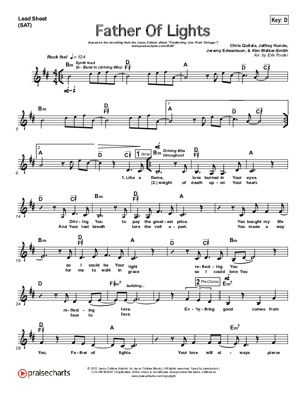 Download the sheet music for Father Of Lights by Jesus Culture / Kim Walker-Smith, from the album Awakening: Live From Chicago. This song was arranged by Erik Foster in the key of D.