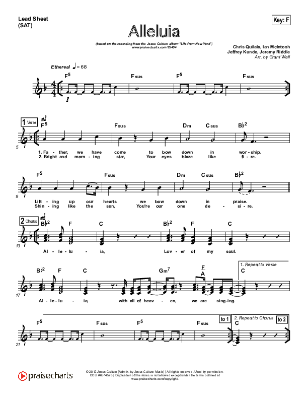 Download the sheet music for Alleluia by Jesus Culture, from the album Live From New York (with Martin Smith). This song was arranged by Grant Wall in the key of E, F.