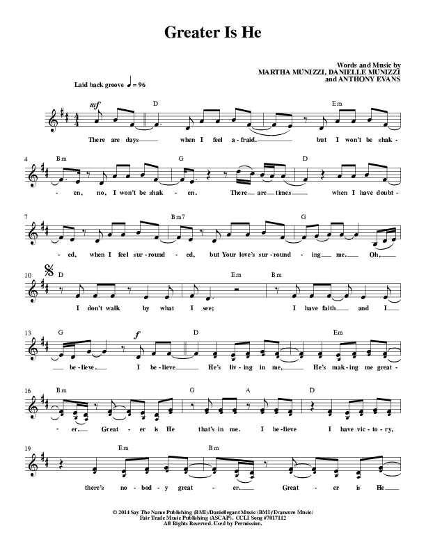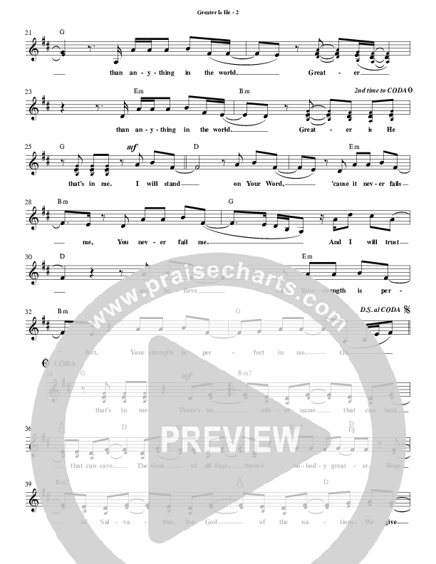 Verse 1 There are days when I feel afraid, but I won’t be shaken no I won’t be shaken There are times when I have doubted When I feel surrounded, but Your love’s surrounding me oh Chorus 1 I don’t walk by what I see I have faith and I believe I believe He’s living in me, He’s making me greater Greater is He that’s in me I believe I have victory there’s nobody greater Greater is He than anything in the world, greater than anything in the world Greater is He that’s in me Verse 2 I will stand on Your Word ‘Cause it never fails me, You never fail me And I will trust and believe that Your strength is perfect Your strength is perfect in me Oh Bridge (There’s) no other name, that can heal that can save The God of all days there’s nobody greater Hope of Salvation the God of the nations We give HIm the praise there’s nobody greater Chorus 2 He’s living in me He’s making me greater Greater is He that’s in me I believe I have victory There’s nobody greater Greater is He than anything in the world Greater than anything in the world Greater is He that’s in me in the world He’s greater than anything anything anything in the world...